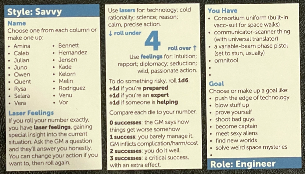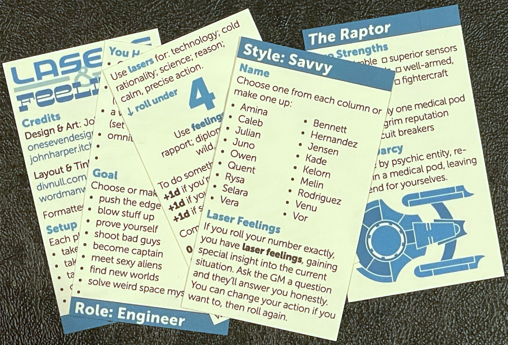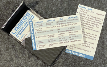 Lasers & Feelings & Business Cards reformats John Harper's Lasers & Feelings to fit on business cards that act as player handouts. Each player picks a style card and a role card, allowing the game to be played quickly anywhere you happen to be. (My family, for example, play fast scenes while waiting for our food in restaurants.)